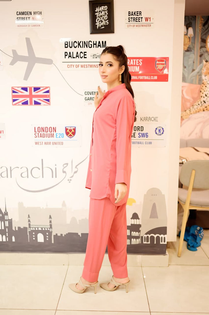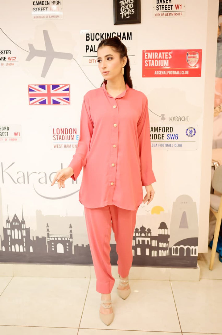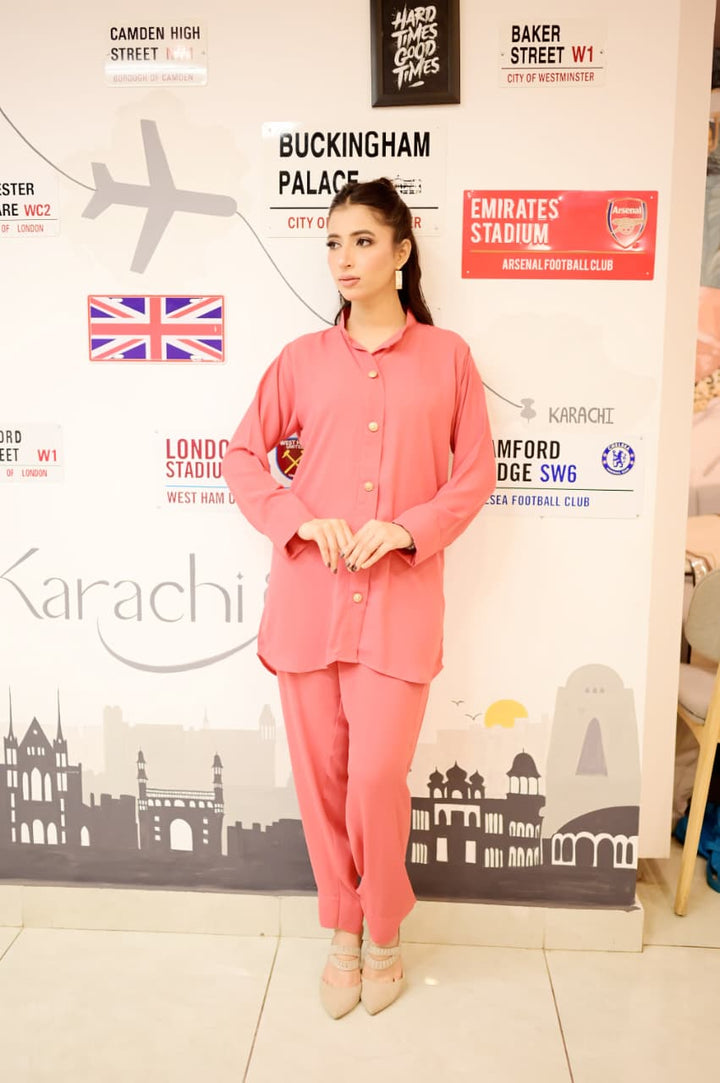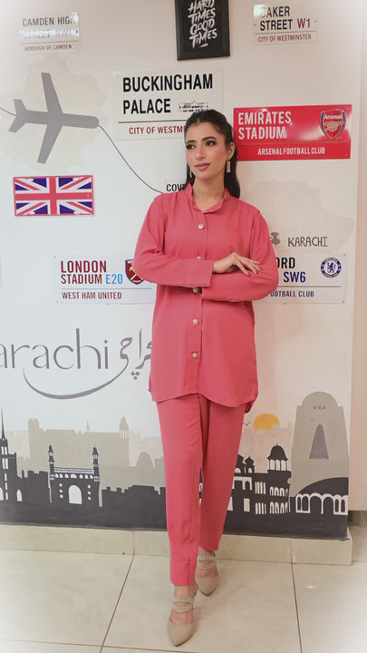 Elevate your wardrobe with the Blush Bloom set, featuring a pink front-open shirt designed with a sleek band collar for a contemporary touch. The coordinating trousers complete the ensemble, creating a harmonious silhouette reminiscent of blooming petals. Its subtle hue and refined structure make it an ideal choice for daytime occasions and festive events, effortlessly conveying a sophisticated and feminine appeal.