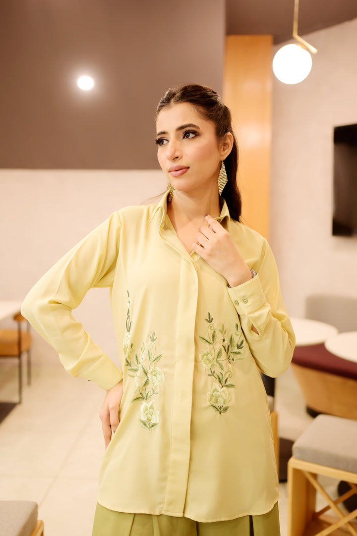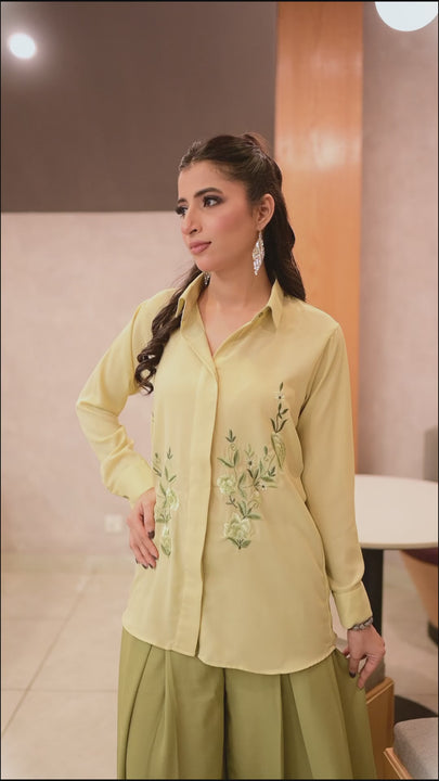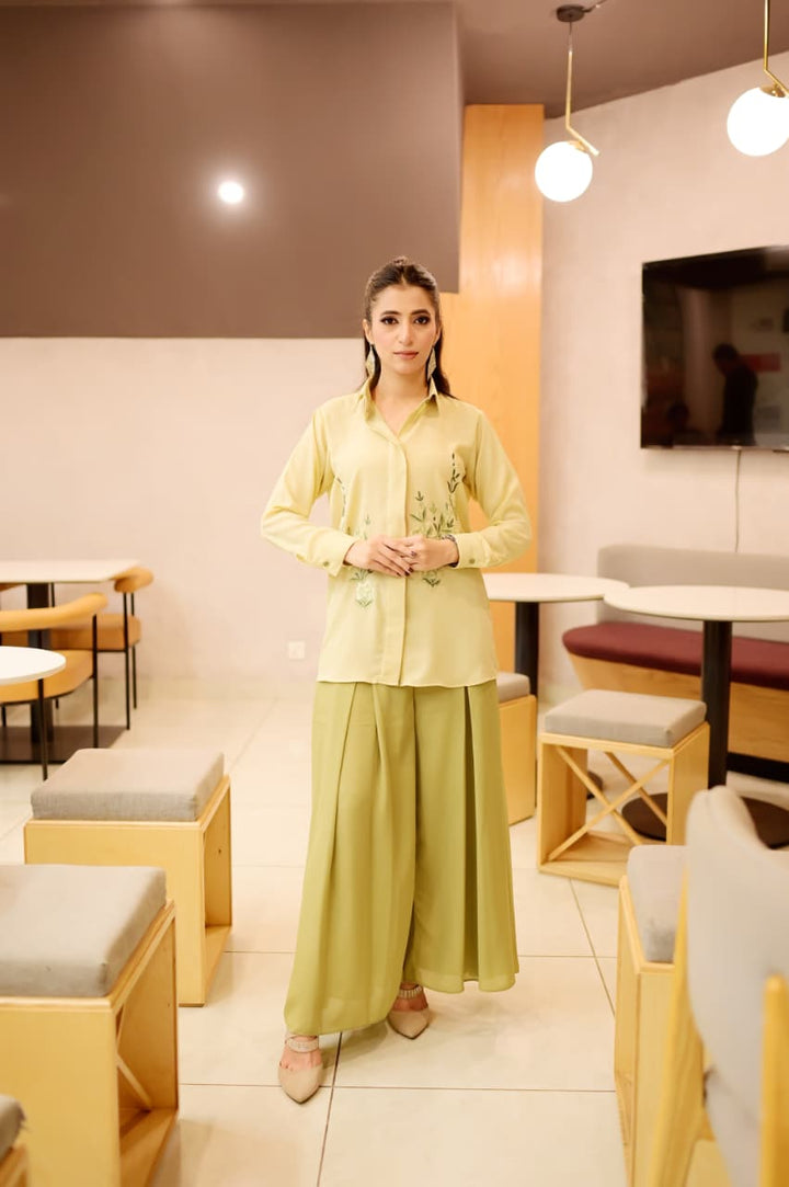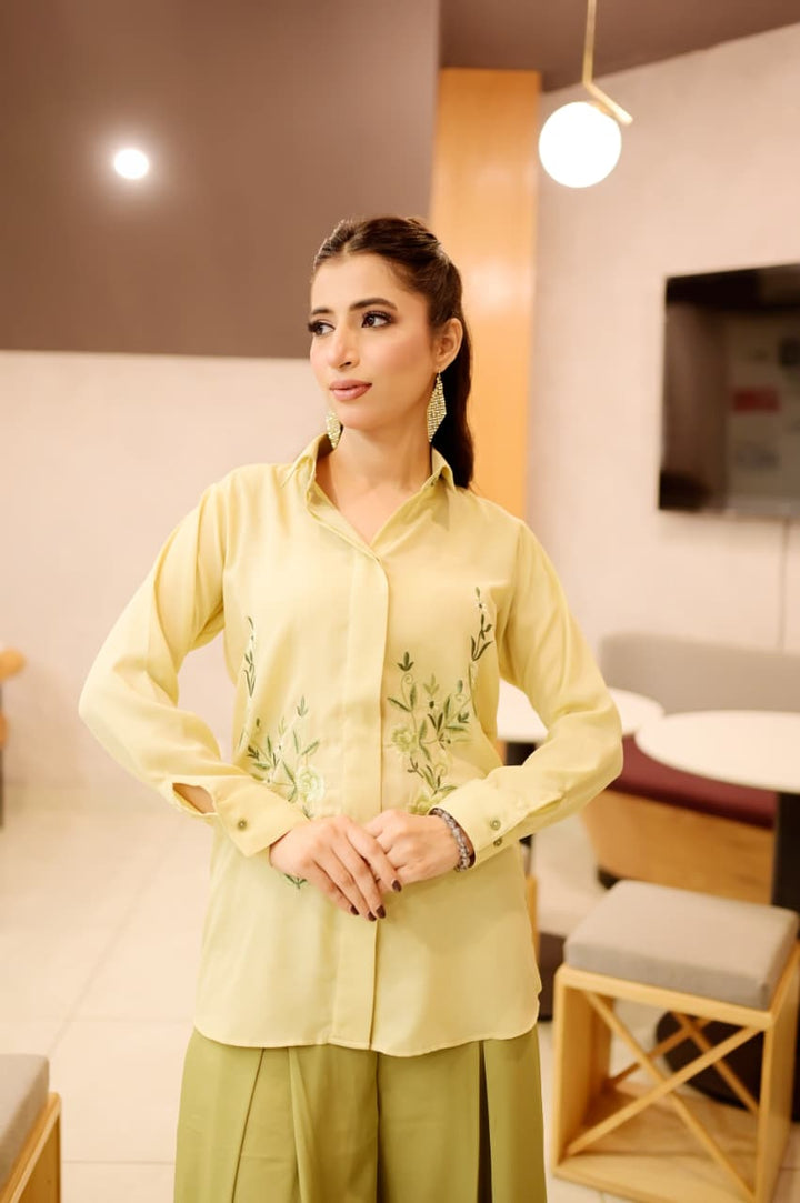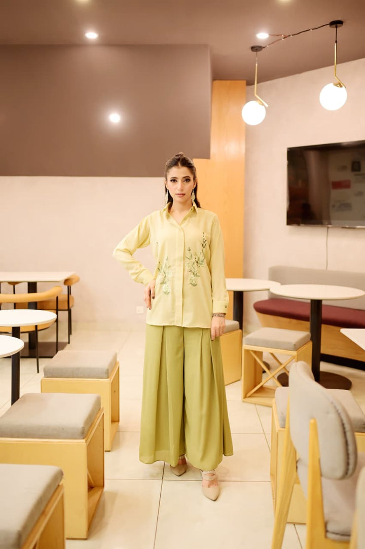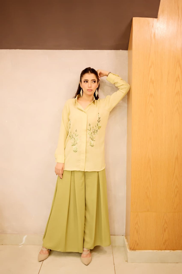 Elevate your wardrobe with the Creamy Drip set, featuring an off-white dress shirt detailed with refined contrast embroidery for subtle artistic flair. Complemented by pistachio trousers crafted with extra-wide legs and structured box pleats, this ensemble balances graceful movement with a modern silhouette. The soft cream and fresh pistachio hues create a sophisticated look ideal for formal events or contemporary daywear.