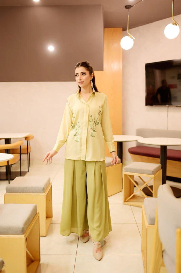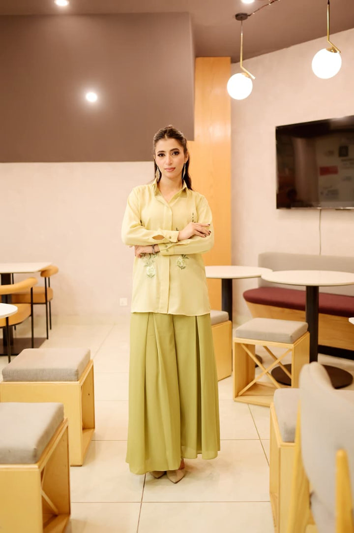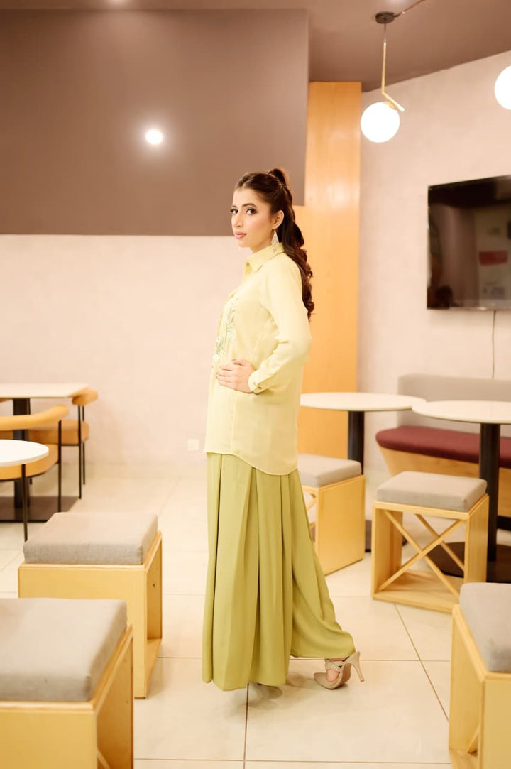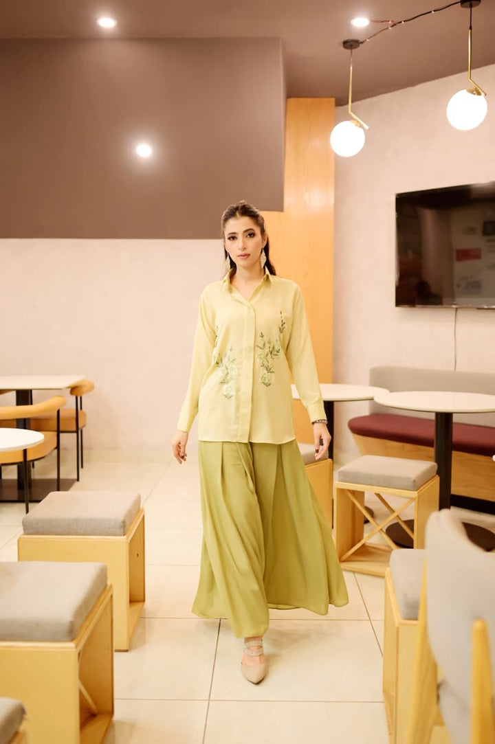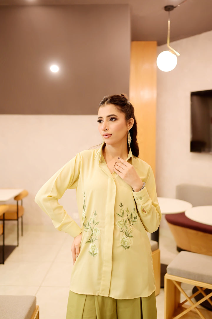 Elevate your wardrobe with the Creamy Drip set, featuring an off-white dress shirt detailed with refined contrast embroidery for subtle artistic flair. Complemented by pistachio trousers crafted with extra-wide legs and structured box pleats, this ensemble balances graceful movement with a modern silhouette. The soft cream and fresh pistachio hues create a sophisticated look ideal for formal events or contemporary daywear.