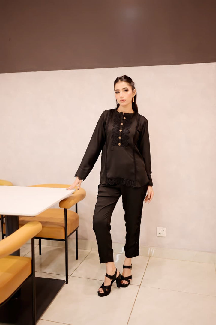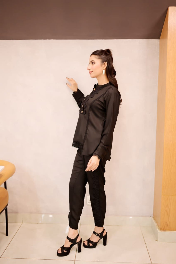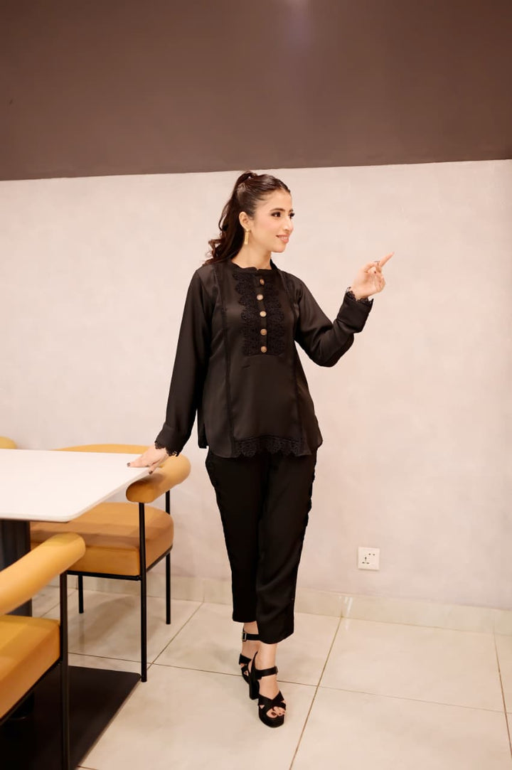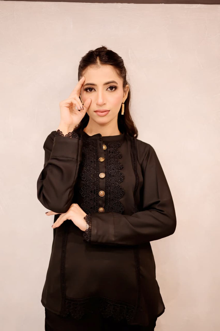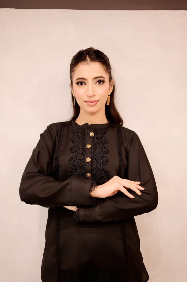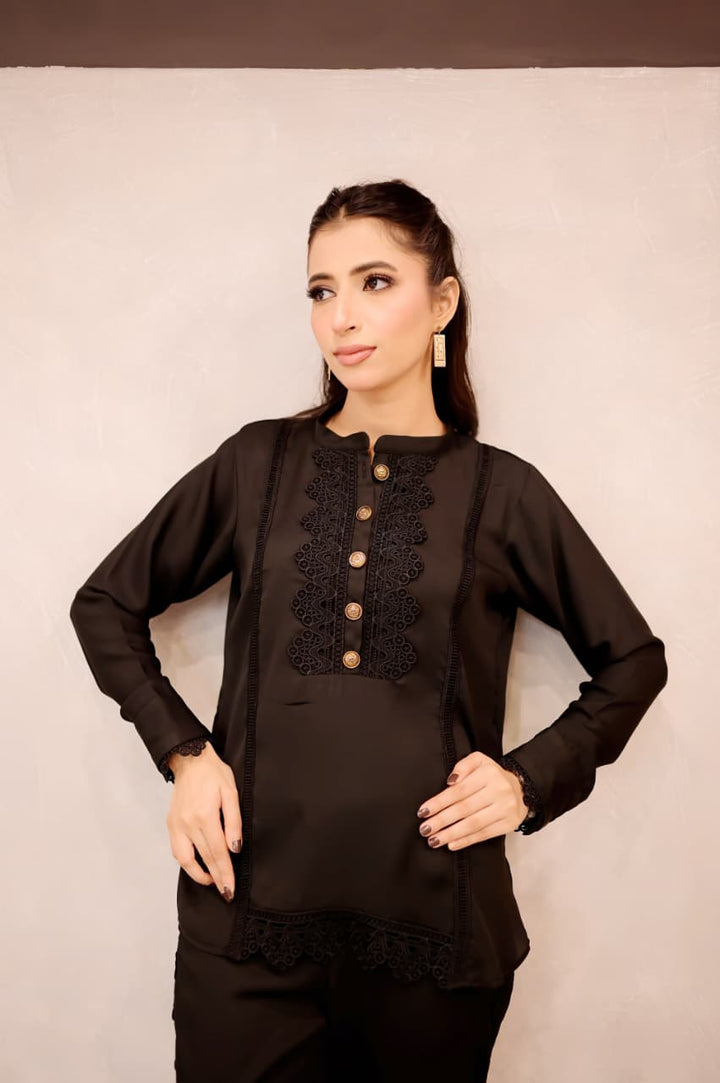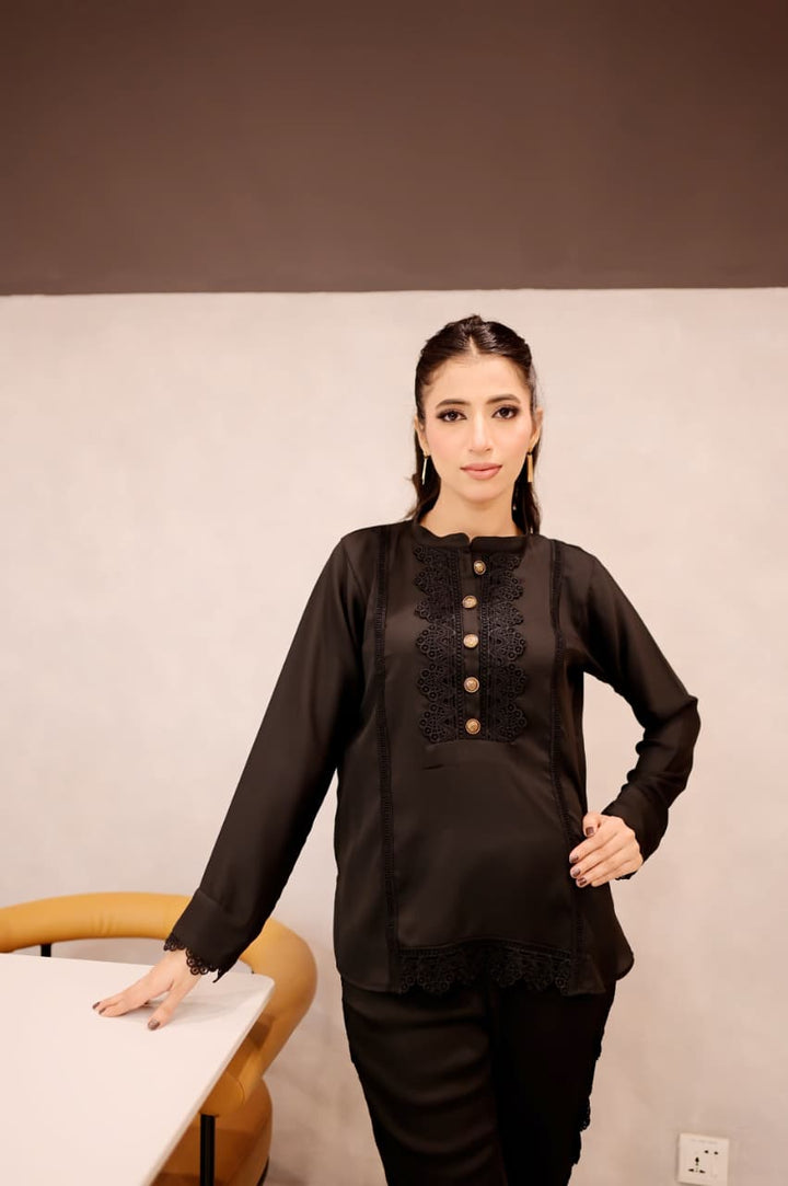 This black short shirt features a sleek band collar and delicate lacework along the bottom sides, combining intricate craftsmanship with a modern silhouette. Its refined details elevate your outfit, offering a signature look that bridges timeless elegance and contemporary style. Ideal for pairing with a range of bottoms, it effortlessly transitions from daywear to evening sophistication.