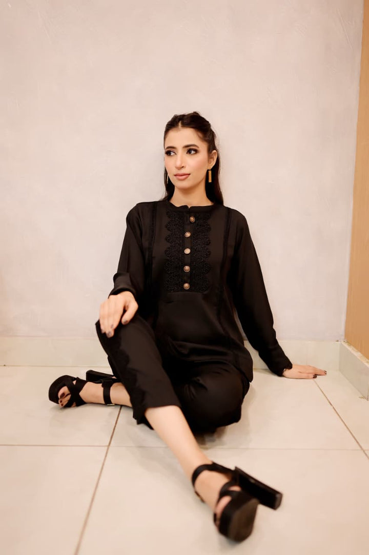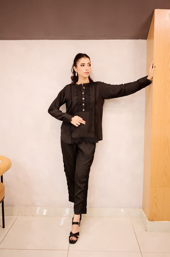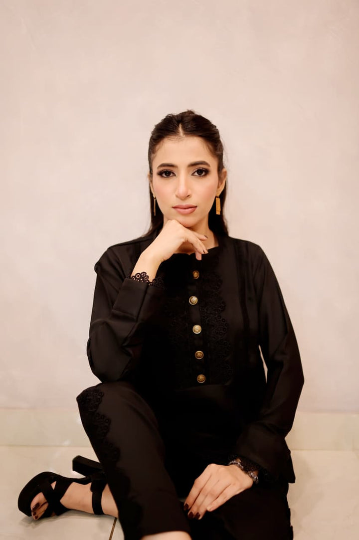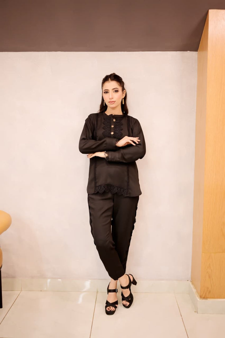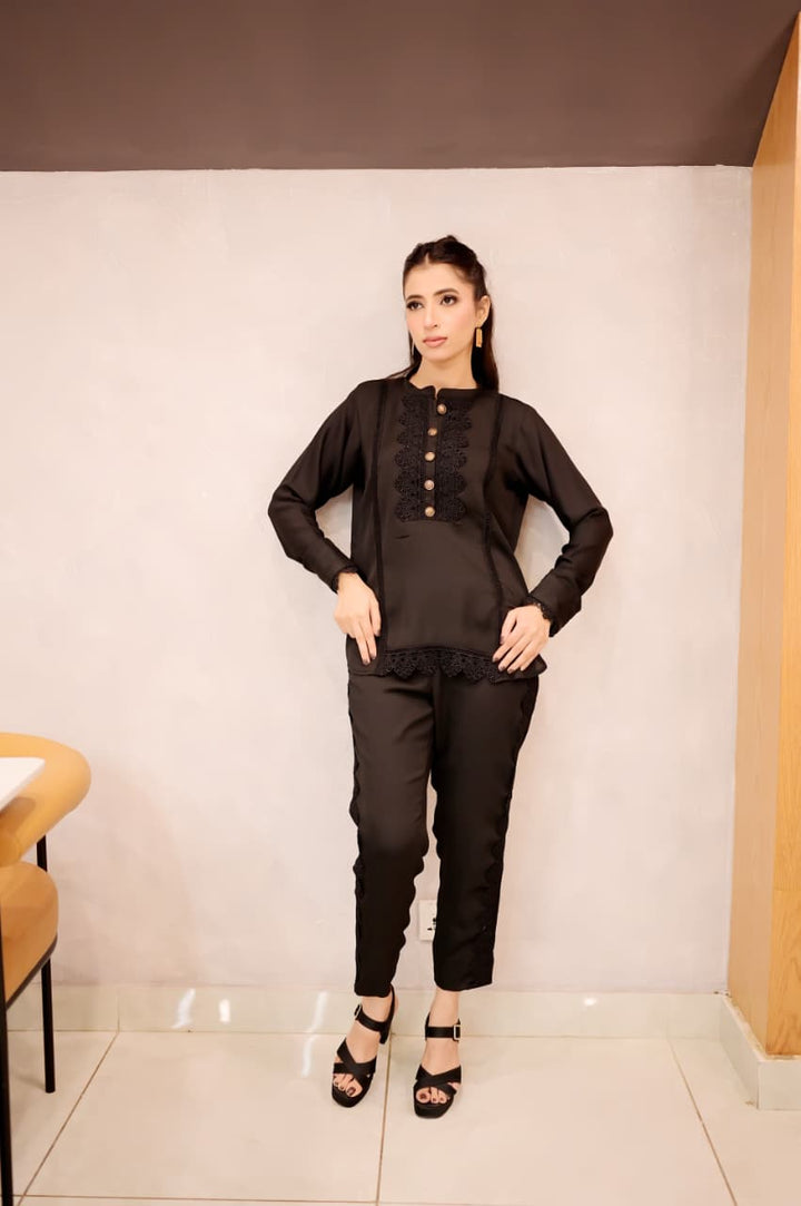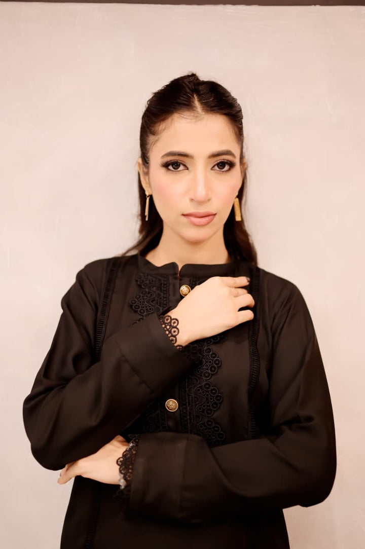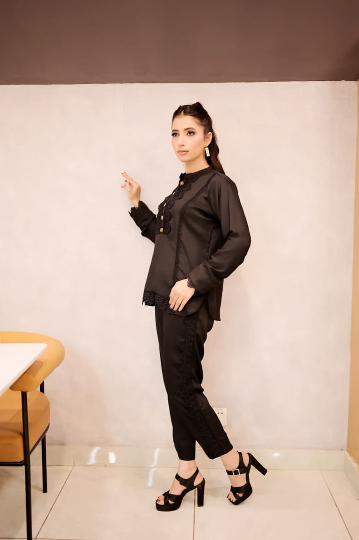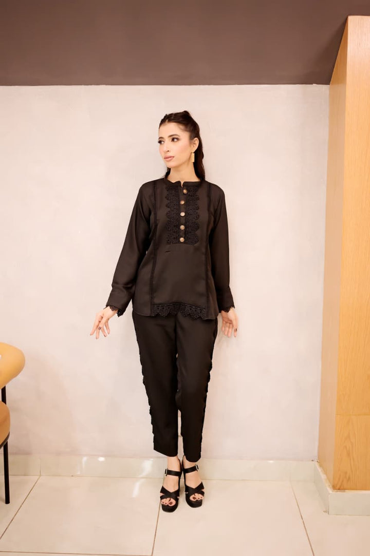 This black short shirt features a sleek band collar and delicate lacework along the bottom sides, combining intricate craftsmanship with a modern silhouette. Its refined details elevate your outfit, offering a signature look that bridges timeless elegance and contemporary style. Ideal for pairing with a range of bottoms, it effortlessly transitions from daywear to evening sophistication.
